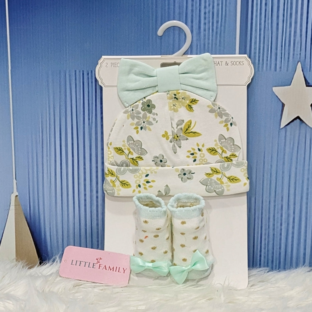 Newborn Cotton Hat & Socks Set – Green Flower Leaves (2-Piece)