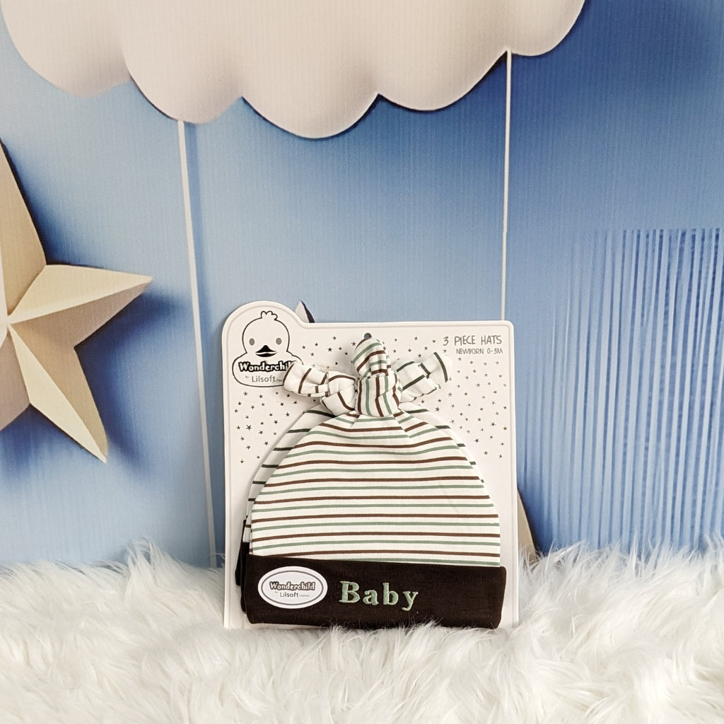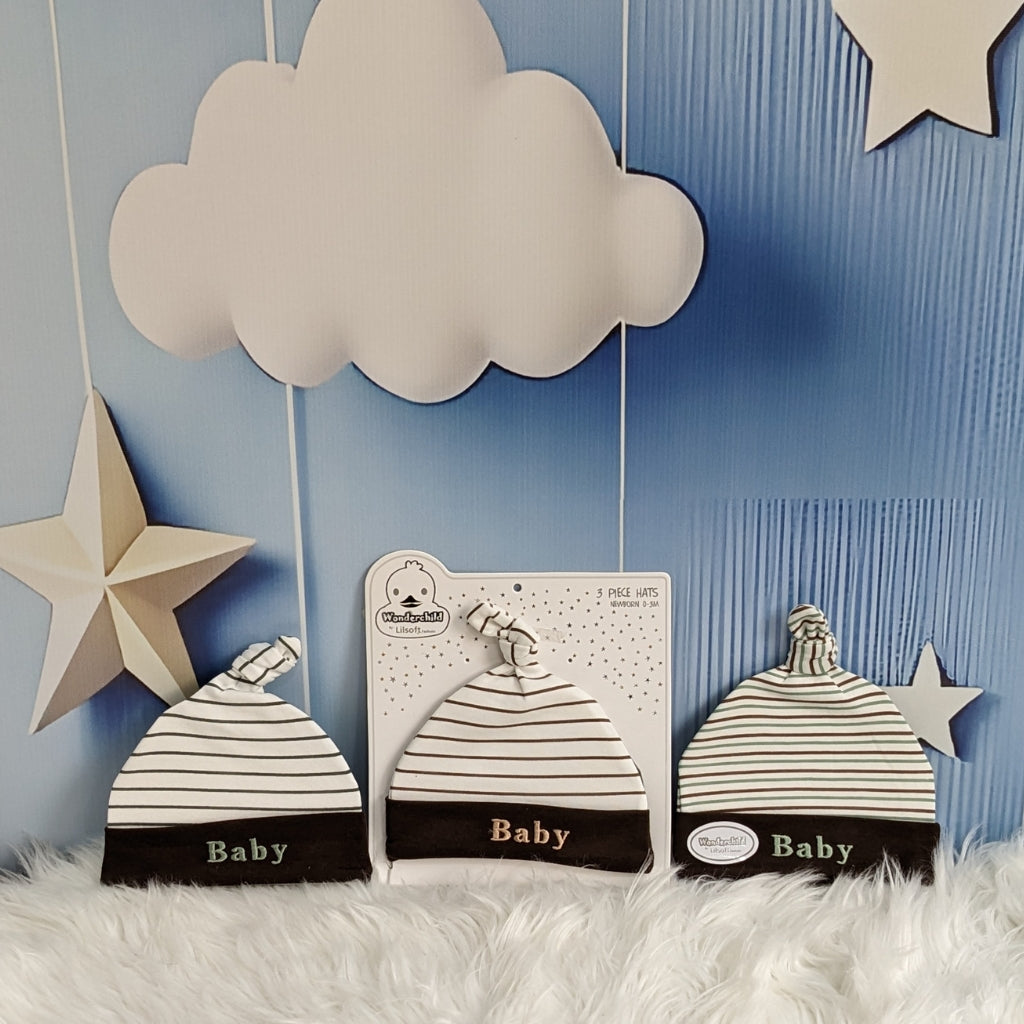 • Versatile Trio Designs – Includes a "Happy Bear" print, classic striped design with “Baby” embroidery, and a sweet polka dot cap with "Happy Journey" message.